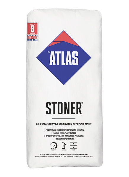 Atlas Gips Stoner - Rowel-applied gypsum for tapeless jointing of plasterboards without the need to use additional reinforcing tape or non-woven fabric for boards with factory-made edges. For boards cut to size on the site, installed in one layer or in places where they may be subjected to high stress conditions (e.g. attic conversion). For wall and ceiling surface repairs – recommended for gypsum-based substrates, for spot repair of gypsum plaster, finish coats or plasterboard. It is manufactured as a dry mix of alpha gypsum, mineral fillers and modifiers. For interior use only.