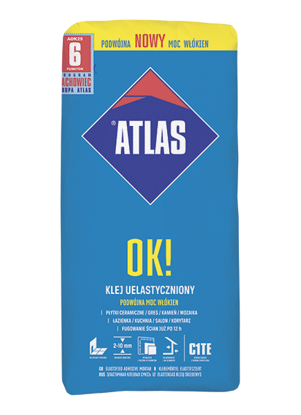 Fästmassa ATLAS OK! har mycket goda mekaniska egenskaper genom att fibrerna skapar en förstärkning i limmets struktur. Efter härdning får limmet de bästa tekniska parametrarna, såsom vidhäftning mot underlaget eller beständighet.