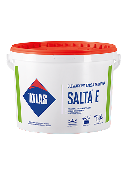 ATLAS SALTA E lämpar sig för målning av ytor som är utsatta för smuts och hög slitage: fasader på skolor, butiker, idrottsanläggningar, anläggningar längs kommunikationsvägar, väggar i trappor, korridorer etc. Det rekommenderas för ytor som utsätts för höga termiska belastningar. Den kan användas för dekorativ och skyddande målning. Typer av målade underlag: cementputs, cementbaserade puts, tunnskiktsmineral- och dispersionsputs, oputsade väggar av betong, tegel, block, keramiska eller silikatblock.