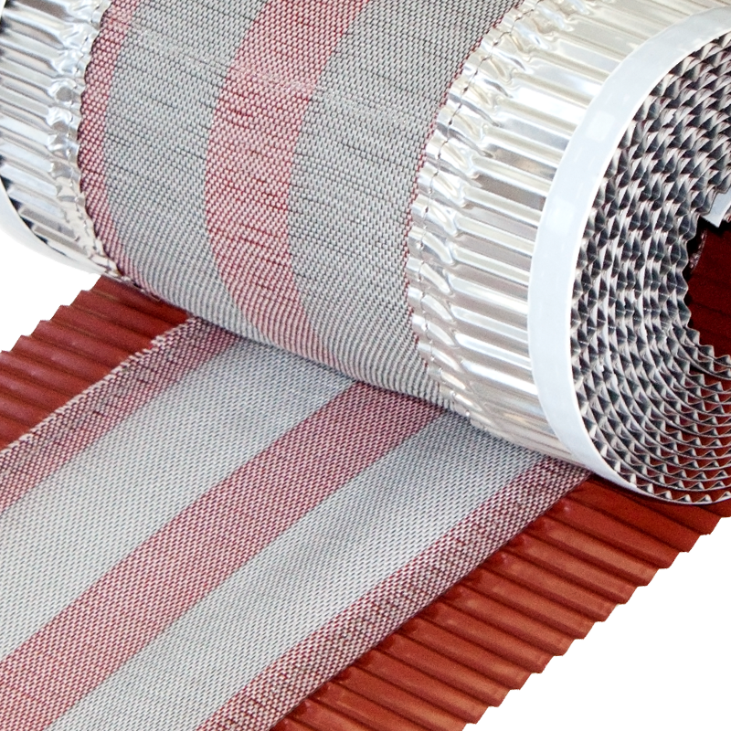 Structure: Two strips of 0.14 mm thick corrugated aluminium, glued and sewn to a technical fabric together with threads resistant to environmental factors; butyl glue strips applied to the edges on the bottom side.