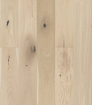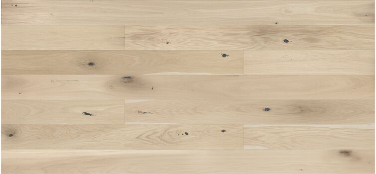Ett 1-stavsgolv ytbehandlat med vit olja som ger eken en mild ljus färgton. Tydligt markerade kanter på brädorna genom fasning runt om.