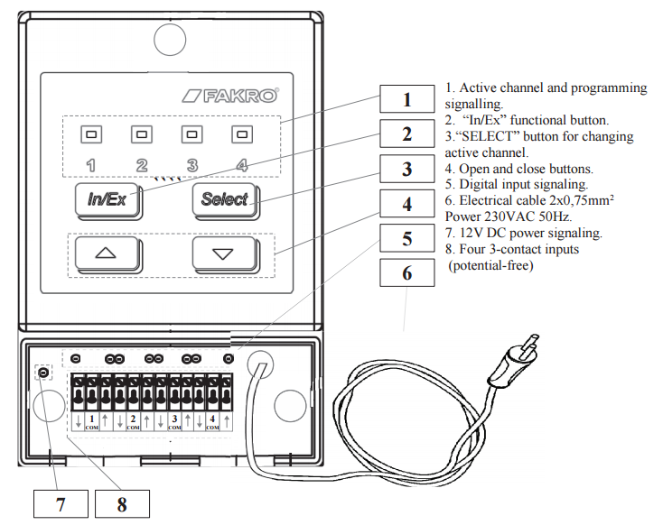 ZWMA adaptation module makes it possible to control FAKRO electric appliances equipped with Z-Wave module e.g. Electro Z-Wave window or roller shutter ARZ Z-Wave with the use of other control system. The module has four double (open - stop - close) digital inputs to which can be connected potential-free signals from various devices e.g external thermostat, time switch, the KNX/EIB system, etc. The module enable control of up to 231 devices simultaneously or in four groups maximum.