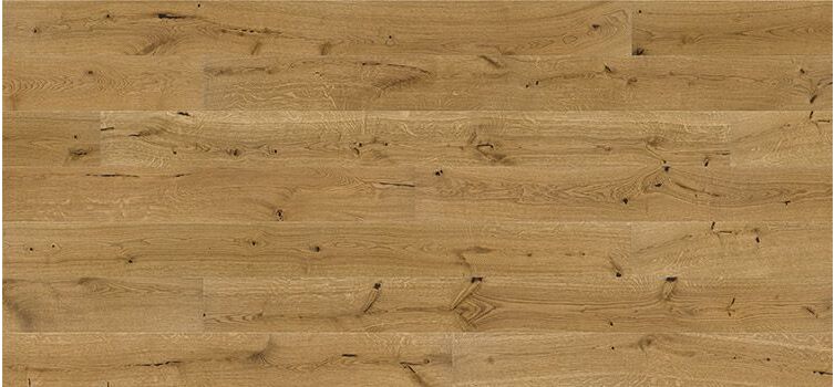 Denna produkt är ett typiskt ekgolv. Det enstaviga golvmönstret har framhävts genom fasning. Årsringarna och den djupa färgen syns mycket tydligt eftersom golvet är borstat och täckt med naturlig olja i en varm brun nyans.
