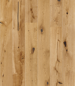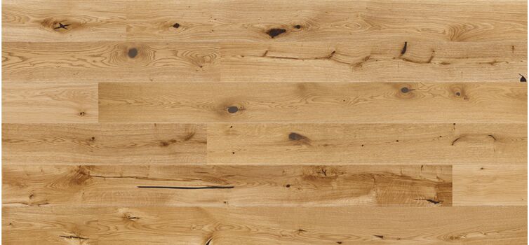 A wide plain board with light dye, distinctive discolourations and wood knots, coated with matte lacquer.