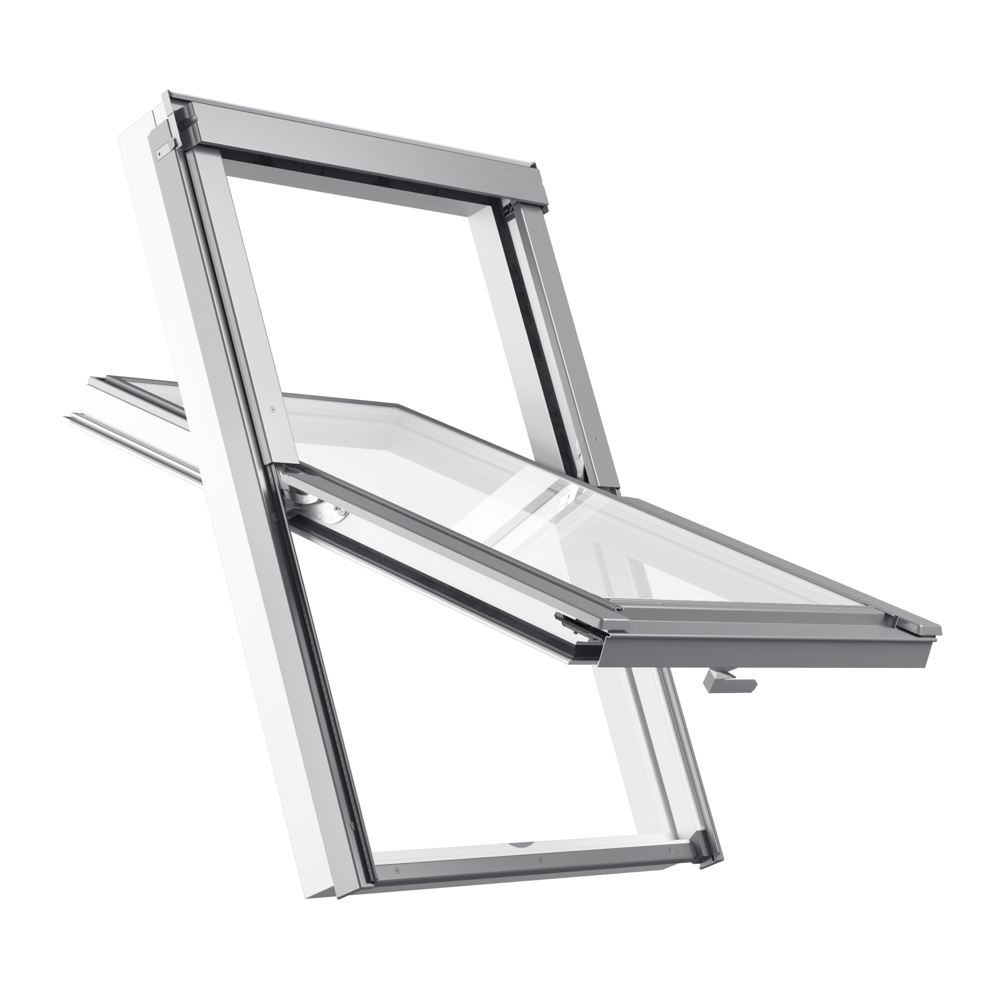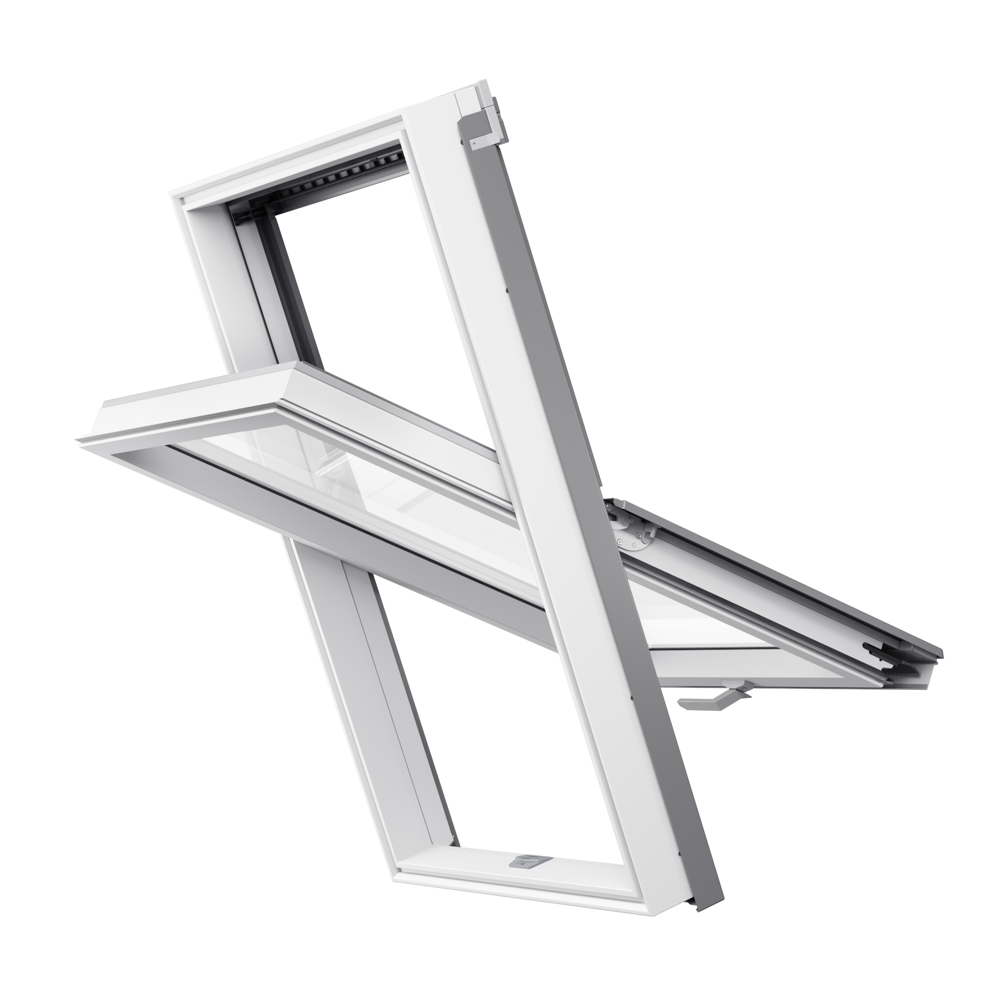 RoofLITE+ SOLID PVC SAFE är ett pivåhängt takfönster (gångjärn sitter på mitten av takfönstret) tillverkat av vit PVC som har en förstärkt profil med inbyggd stålkärna.