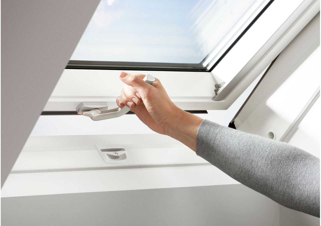 Ett pivåhängt takfönstret VELUX GLU-B 0061 i everfinish utförande manövreras med ett elegant handtag på fönstrets nedre del. Rekommenderas särskilt i situationer när fönstret ska installeras i ett upphöjt läge, t.ex. på grund av hög stödbensvägg. Utrustad med ett nytt tvåstegsventilationssystem som gör möjligt att vädra när takfönstret är stängt, t.ex. på regniga dagar.