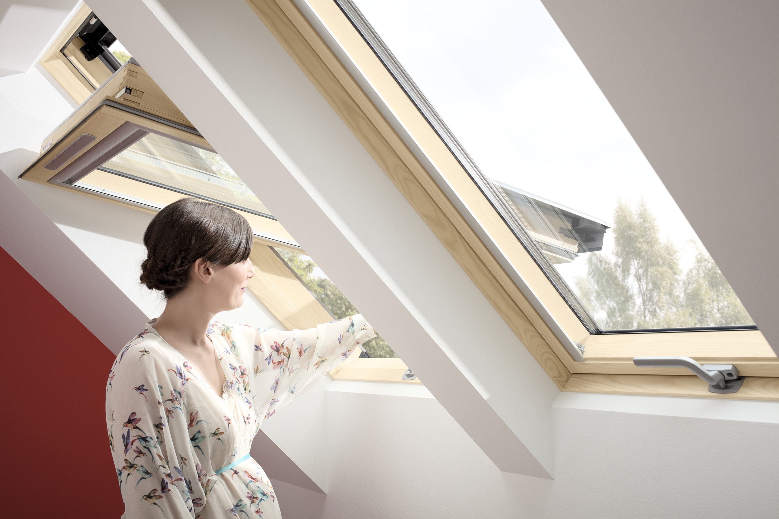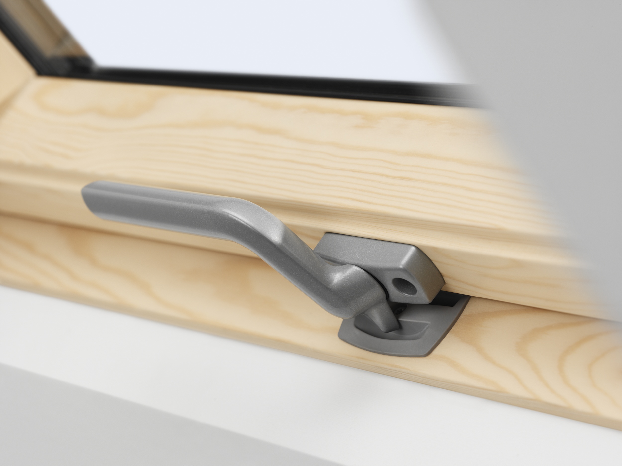 Ett pivåhängt takfönstret VELUX GZL-B 1051 av naturligt furu manövreras med ett elegant handtag på fönstrets nedre del. Rekommenderas särskilt i situationer när fönstret ska installeras i ett upphöjt läge, t.ex. på grund av hög stödbensvägg.