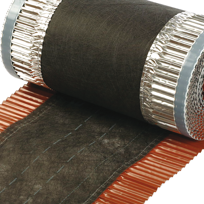 Structure: Two strips of 0.14 mm thick corrugated aluminium, glued and sewn to a technical fabric together with threads resistant to environmental factors; butyl glue strips applied to the edges on the bottom side. This product is also available in copper version.