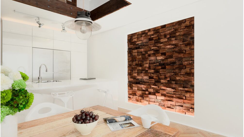 Axen panel in the form of rectangular split elements emhesizes the simplicity of the interior and at the same time soften the minimalist architecture of the room. Warm tone of natural wood breaks rought structure of the panel. Irregular three-dimesional texture is na elegant accent in the office environment, living room or hallway.